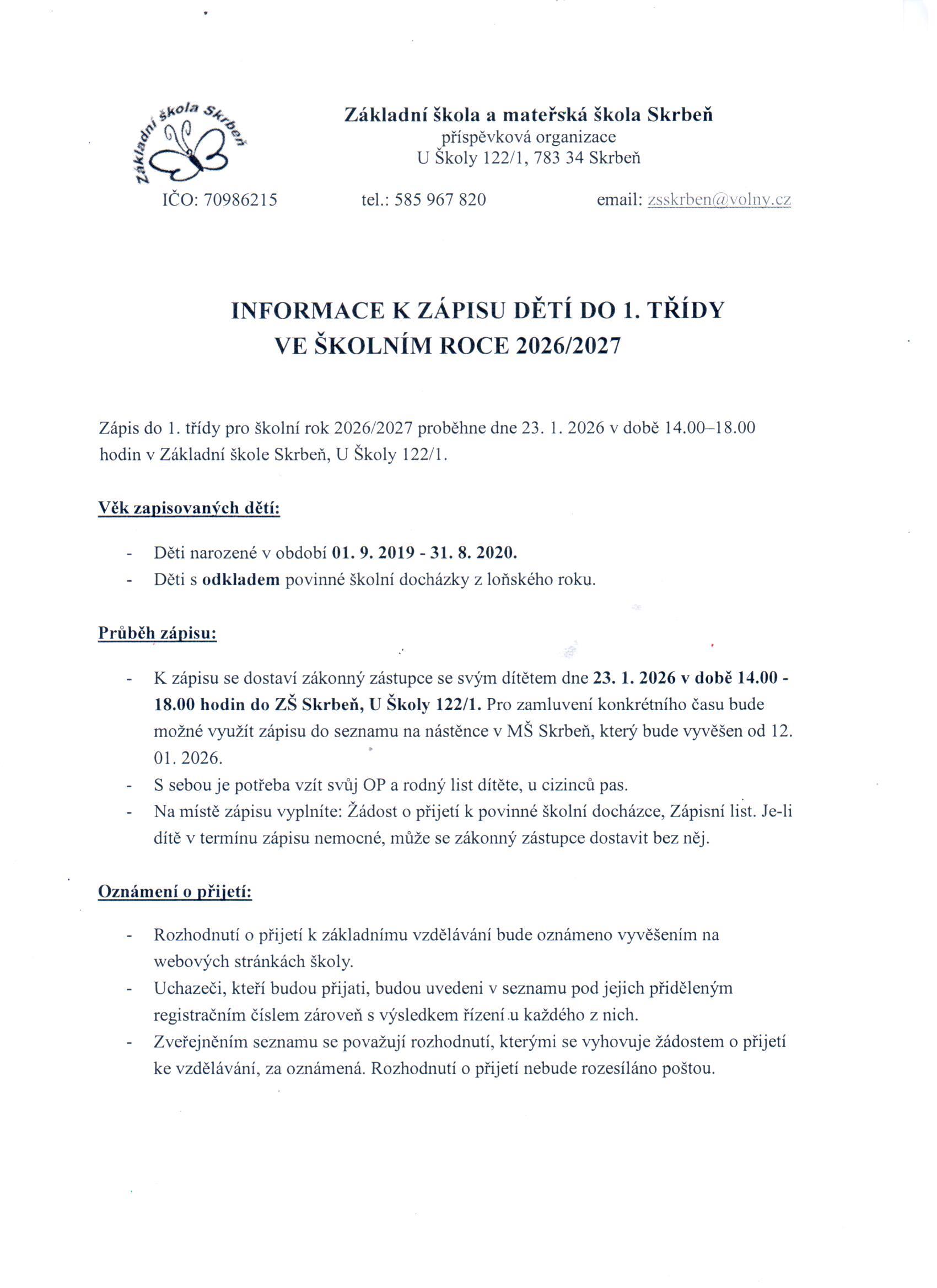 Informace k zápisu na školní rok 2026/2027
